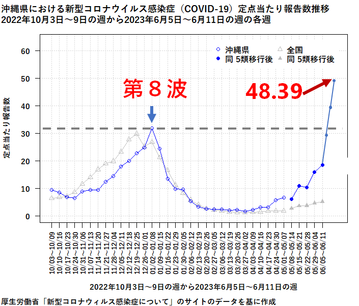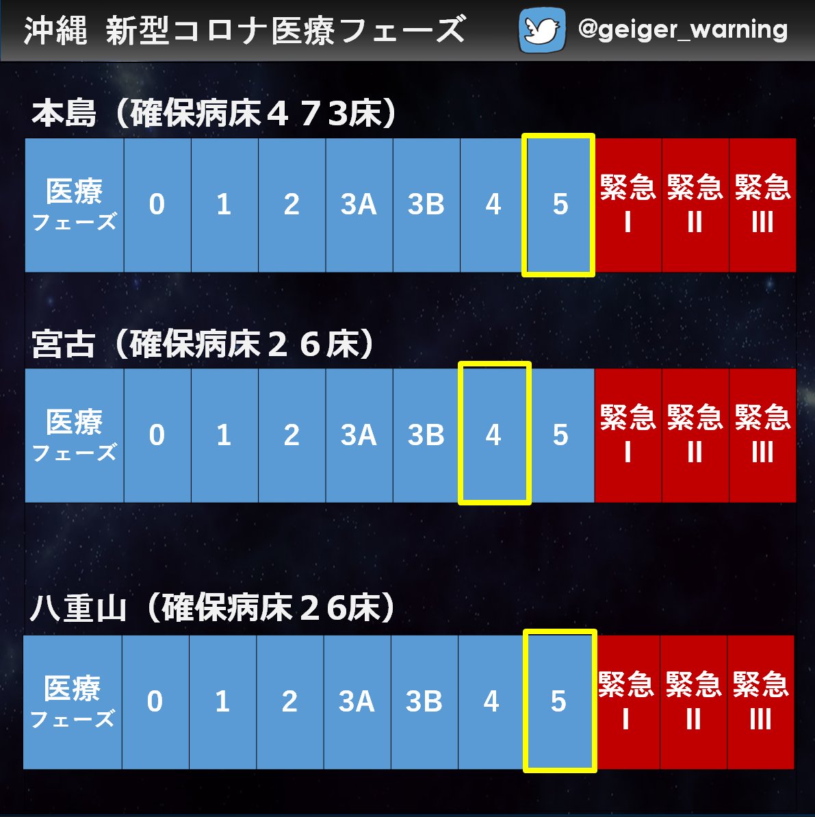 【速報】沖縄定点あたり40人以上の模様(先週39.5)😿沖縄全ての地域医療フェーズ5になりました。5類なので保健所は病床把握も調整もしません。重症化リスクのある方の入院難民が心配です。