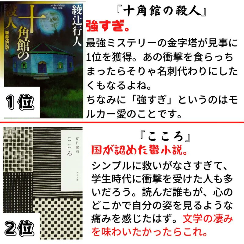 読書好き約1500人が選んだ小説ランキングが熱い! 『十角館の殺人』『こころ』など数々の名作が凝縮