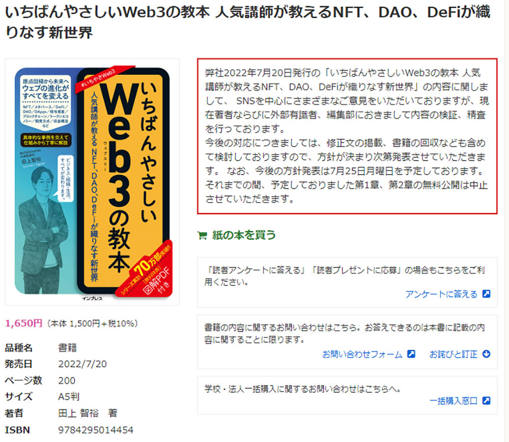 「ほとんどの説明が間違えてる」インプレスが『いちばんやさしいWeb3の教本』無料公開を取りやめ 書籍の回収も検討 nlab.itmedia.co.jp/nl/articles/22…