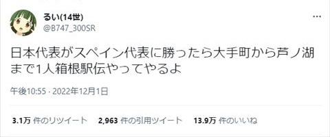 「日本がスペインに勝ったら1人箱根駅伝やってやるよ」→実行決定 「ドイツに勝ったら自転車で山口から東京」の人が再びフラグを立てて回収 nlab.itmedia.co.jp/nl/articles/22… @itm_nlabより