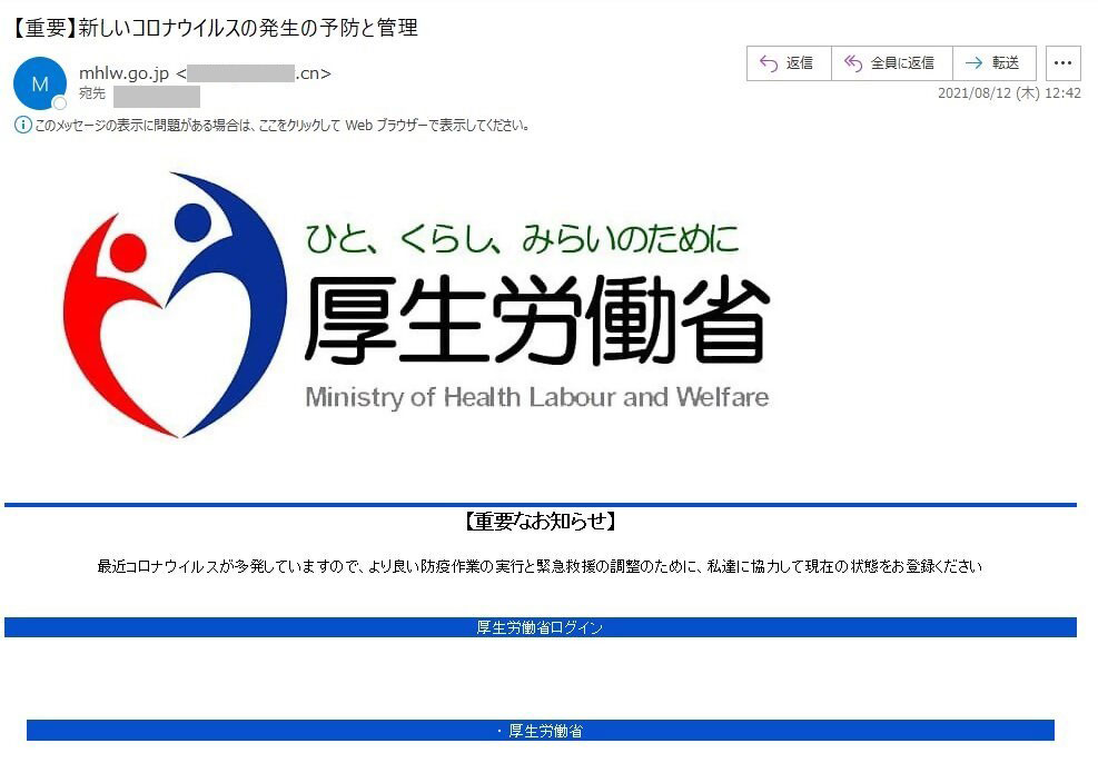 厚労省をかたるフィッシングメールに注意 新型コロナの「現在の状態をお登録ください」と偽サイトに誘導