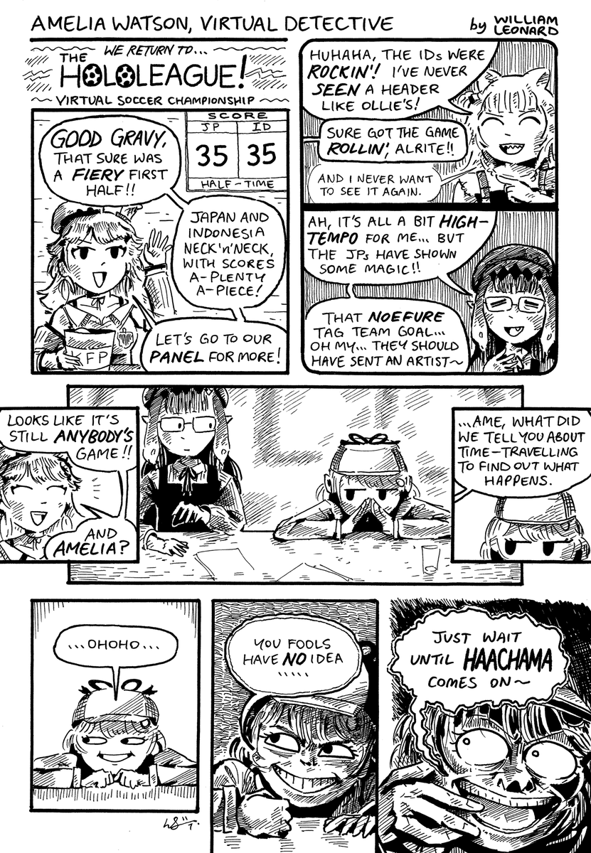 well, tonight's the BIG GAME... the hololive soccer final!!! we go to the english commentary team for their half-time analysis.... #ameliaRT #artsofashes #gawrt #inART