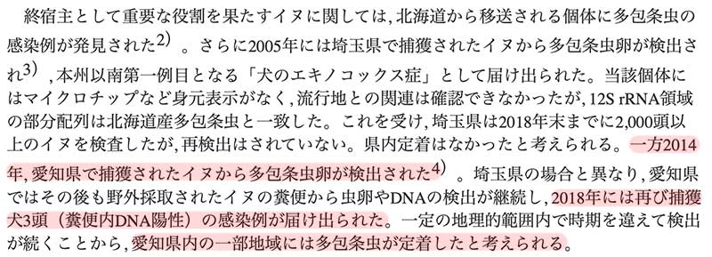 エキノコックスの本州定着が話題になっているが、2019年3月の国立感染研の月報を見るに愛知県では2014年に初検出され2018年には既に定着と認識。今に始まったことではない。