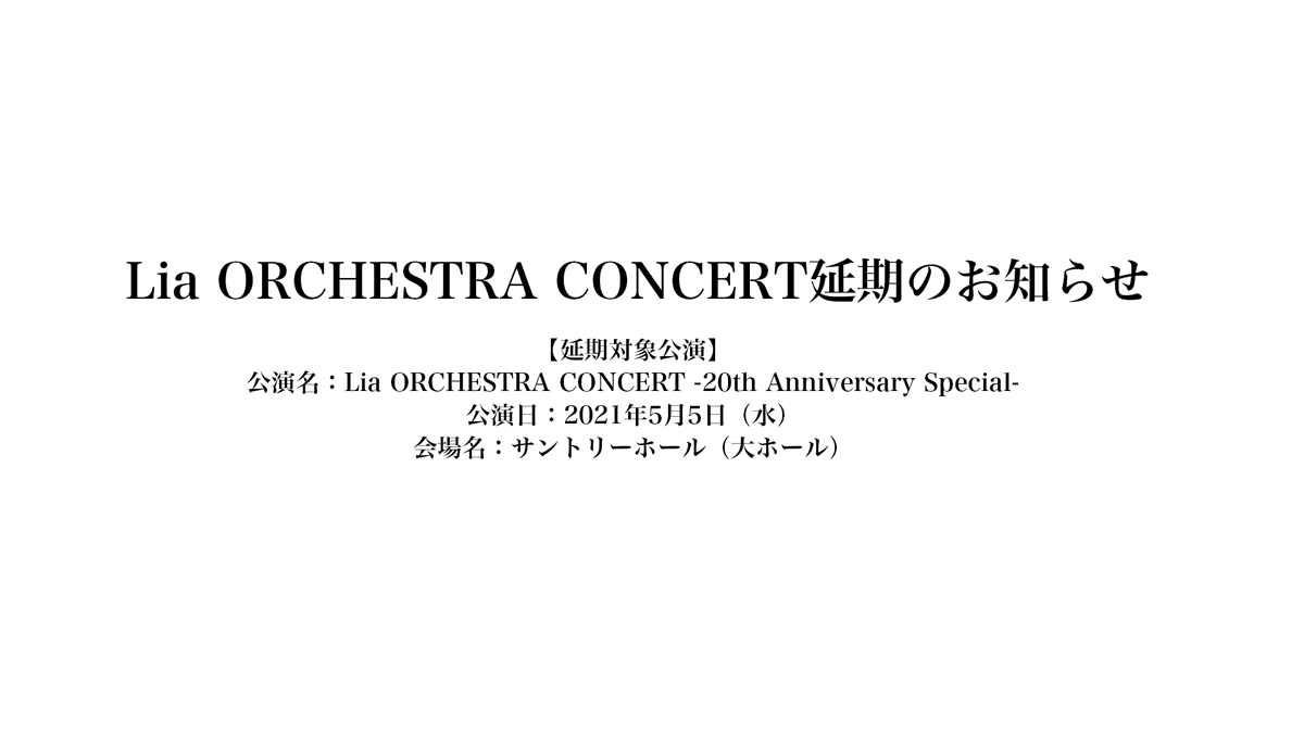 再延期でお知らせした「Lia ORCHESTRA CONCERT」について、緊急事態宣言の延長や感染拡大が改善されないことを考慮し、残念ではございますが、中止とさせて頂くことになりました。チケット払い戻し方法、期間は改めてお知らせいたします。