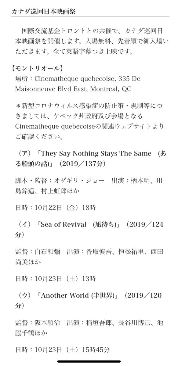 いよいよ土曜日、モントリオールでは、#凪待ち と #半世界 の同時上映の日。#モントリオール で #日本映画 に興味のある現地の方々もたくさん足を運んでくださるといいな。