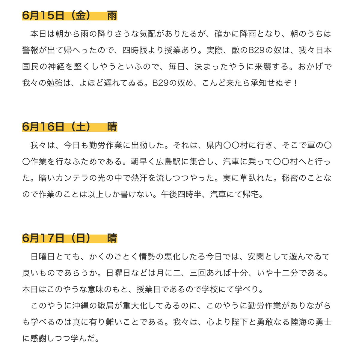 1945年6月16日分の日記原文とツイート。