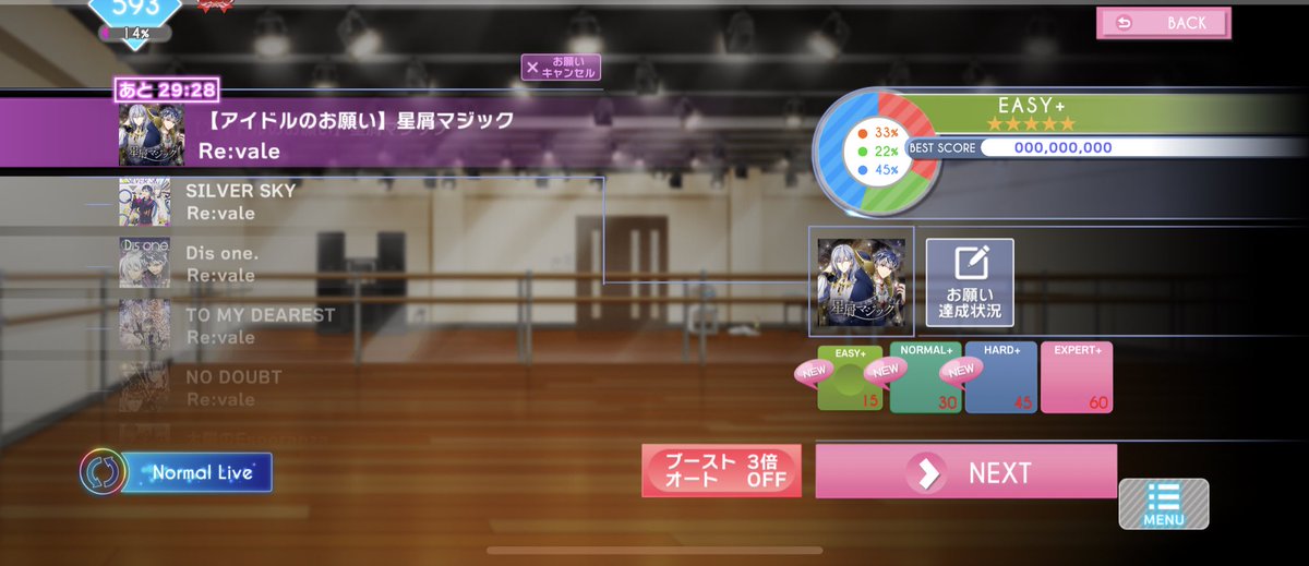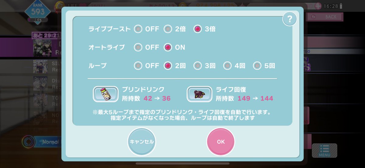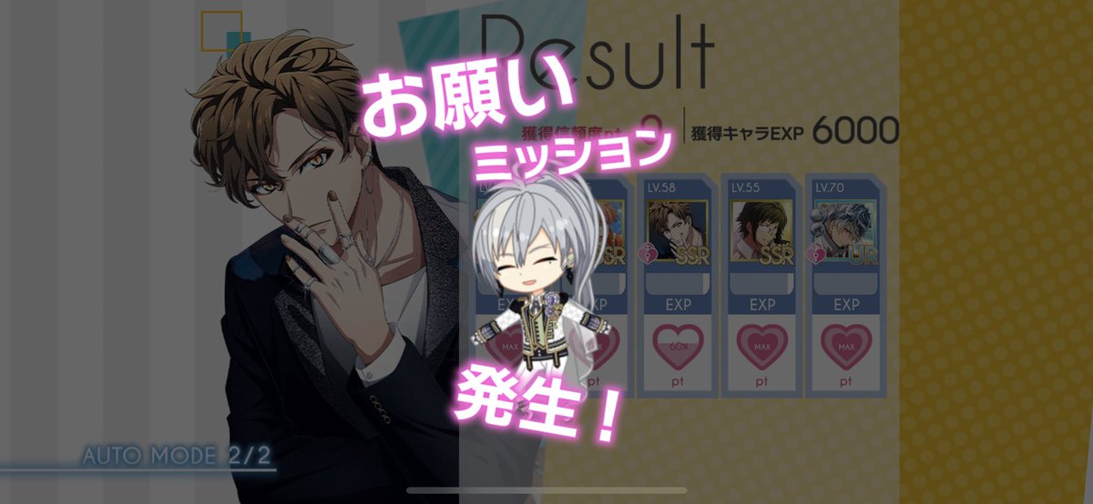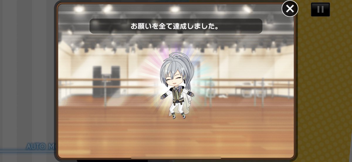 もし面倒くさくなければ、オートは2回ずつ回すのがオススメ。お願いはオートでもクリアできるので、お願いの曲を選んでオート2回回すと、お願いを叶えた上で次のお願いが発生します。それをひたすら続けると毎回お願いこなしながら無限に回せます。