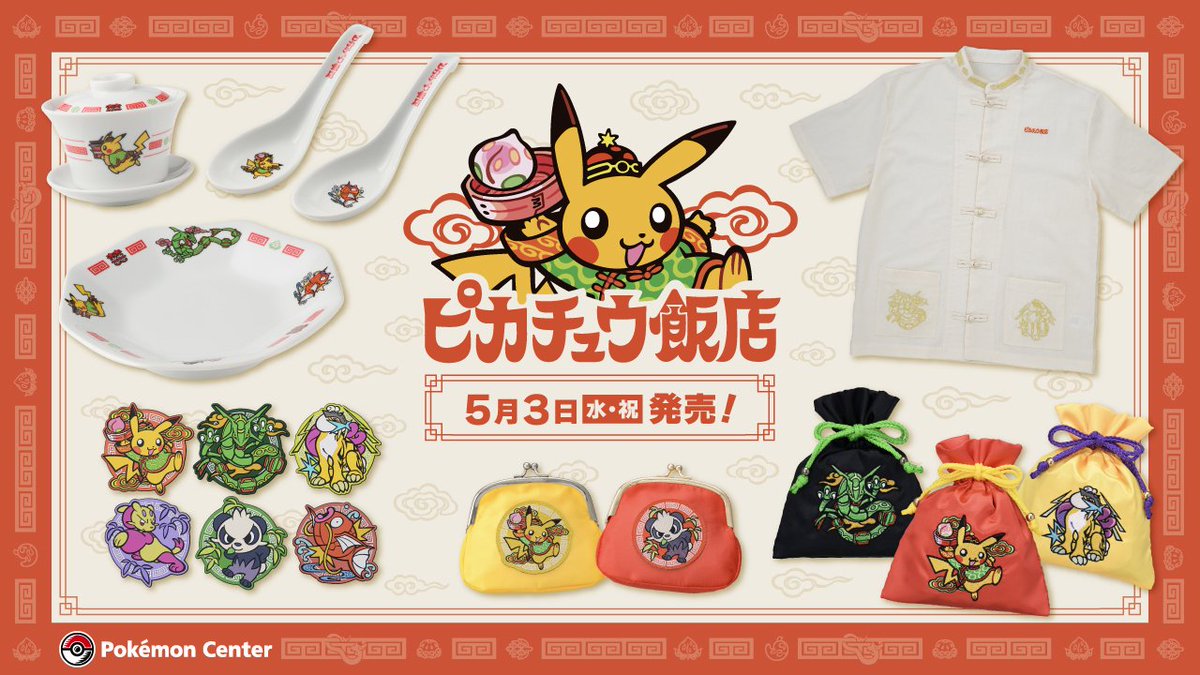 レックウザやライコウ、ヤンチャム、コジョフー、コイキングたちが描かれたどんぶりやお皿、中国の民族衣装風シャツなどがラインナップ