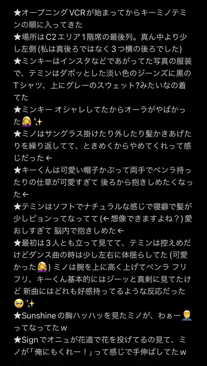 私の前の列にSHINee御三方おられました🥹❤️ SHINee越しにオニュを見る日が来るとは🤦♀️🤦♀️💕✨色々気になってオニュだけに集中する事は出来なかったけど←、なかなか経験できない特別な時間でした💎✨SHINee最高👍👍💕✨