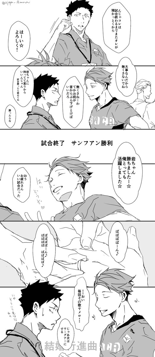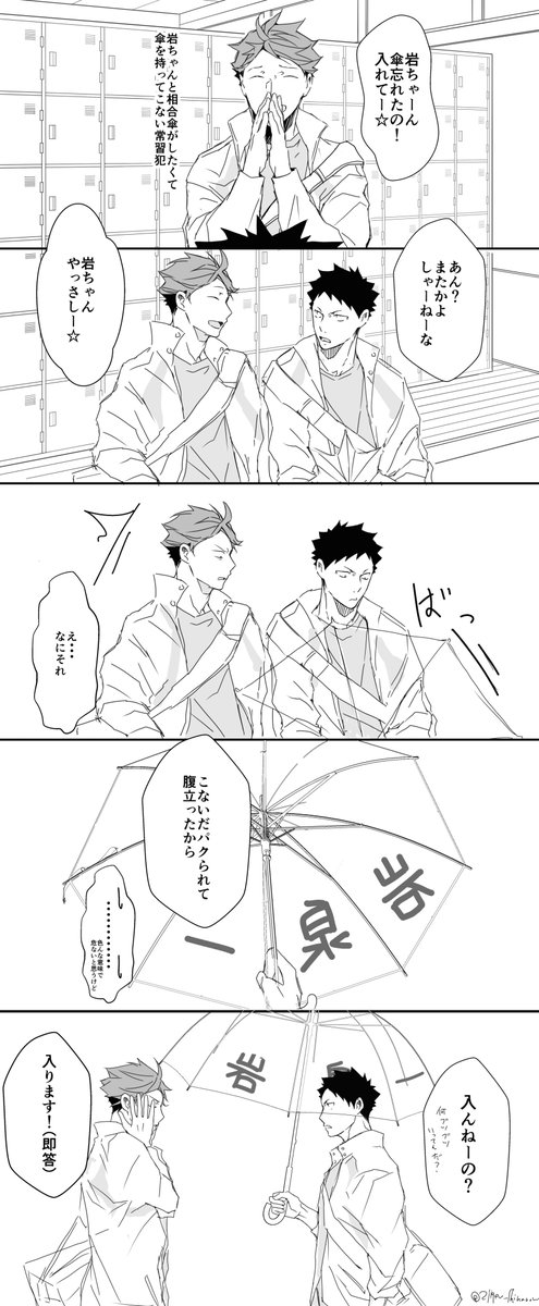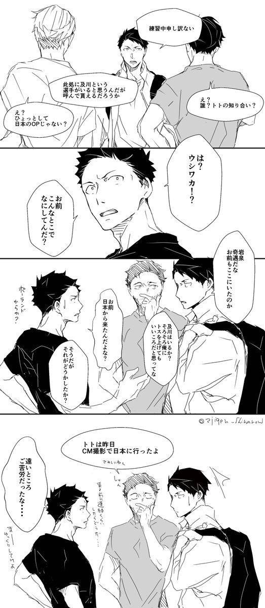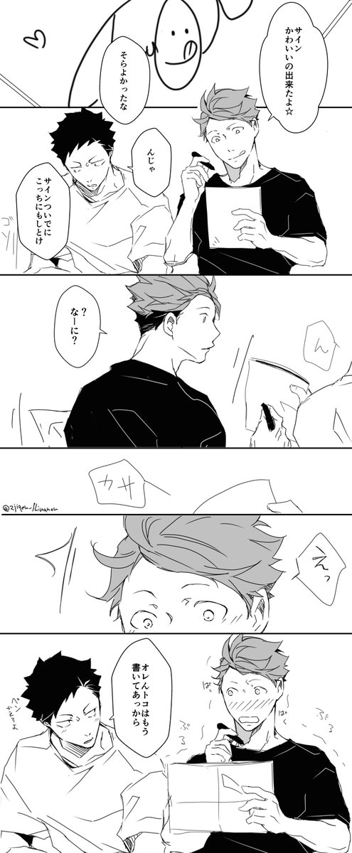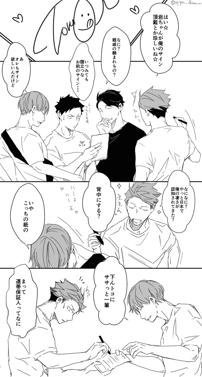 お互いにサインしあいっこじゃれあいになっちゃう岩及。みみさん @chococircus とお互いざっくり同じシチュで描きました☆+1.5hくらい