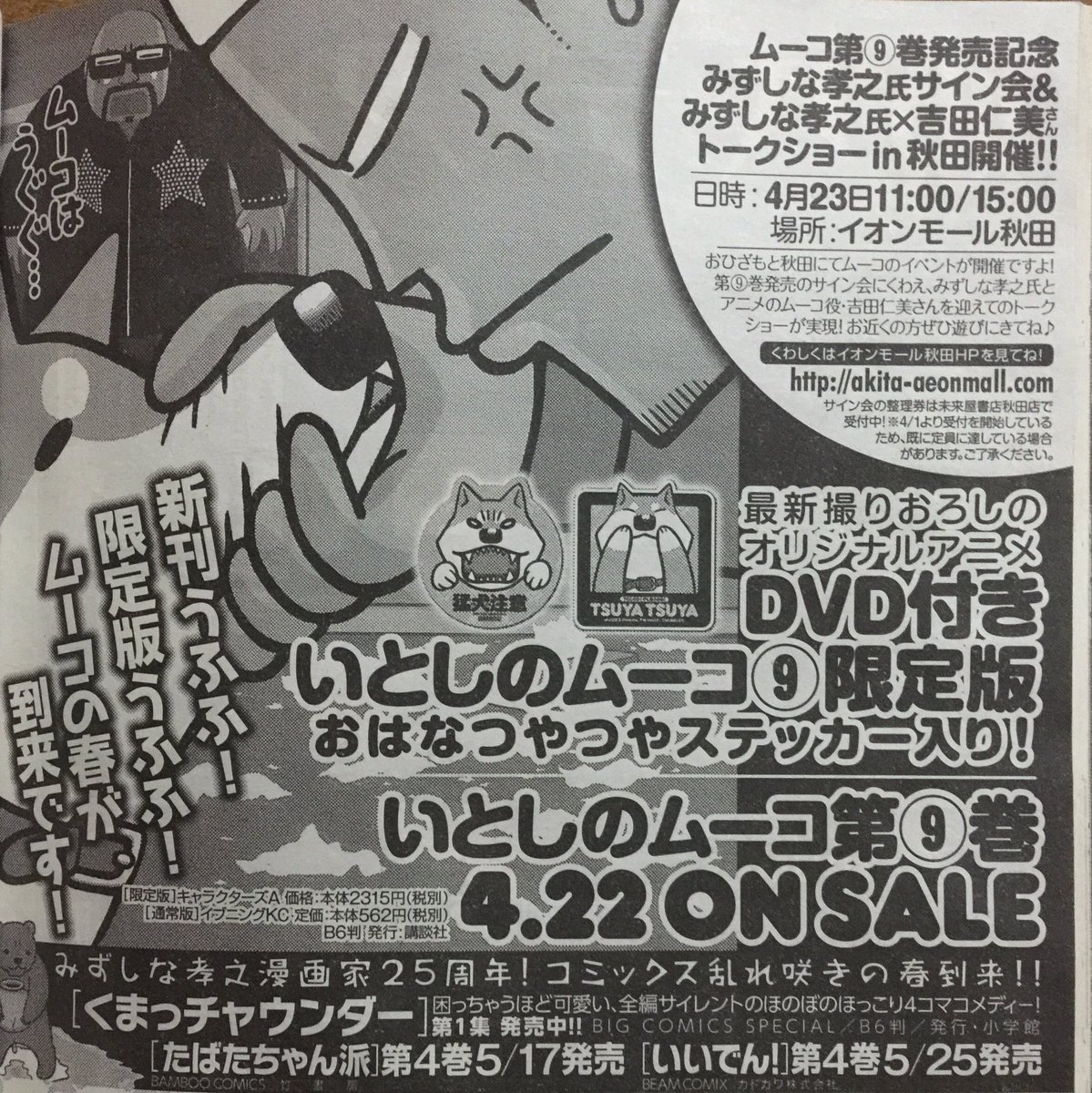 そんなみずしなさんの『いとしのムーコ』9巻はつばいちゅう!そしてイベントもやるみたいです!!!akita-aeonmall.com/news/shops/2875