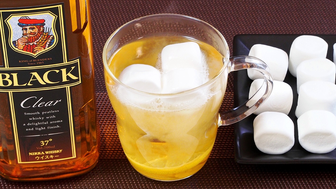 耐熱グラスに #ブラックニッカ クリアと熱湯を注ぎ、レモンスライスとマシュマロを2、3個入れる(個数で甘み調整)!…す・る・と