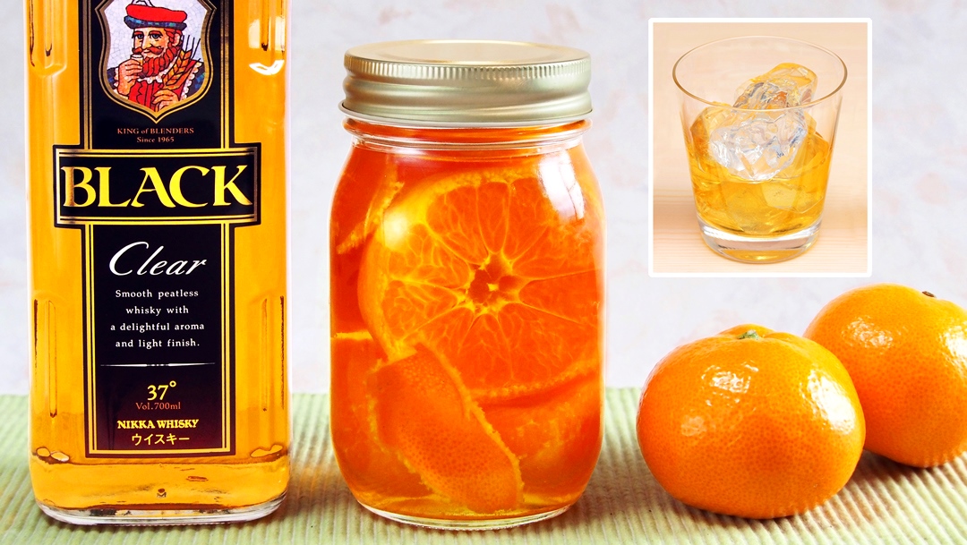 漬込み用瓶にみかんの実と皮、砂糖、#ブラックニッカ クリアを入れる!冷暗所に保存し、約3日で華やかな香りの漬込みウイスキーが完成!輪切りを皮ごと入れてもOKじゃが、なるべく白いわたを取り除くとよりおいしく出来るぞい!