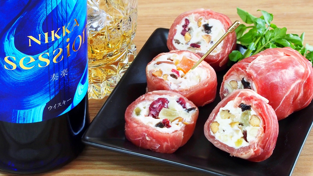 クリームチーズを容器に入れ、ウイスキーを少量加えて1分弱レンチン!砕いたナッツとドライフルーツを混ぜる!ラップに生ハムを敷き、混ぜたチーズを乗せて巻く!冷蔵庫で冷やし、切り分けて完成!絶品じゃよ!