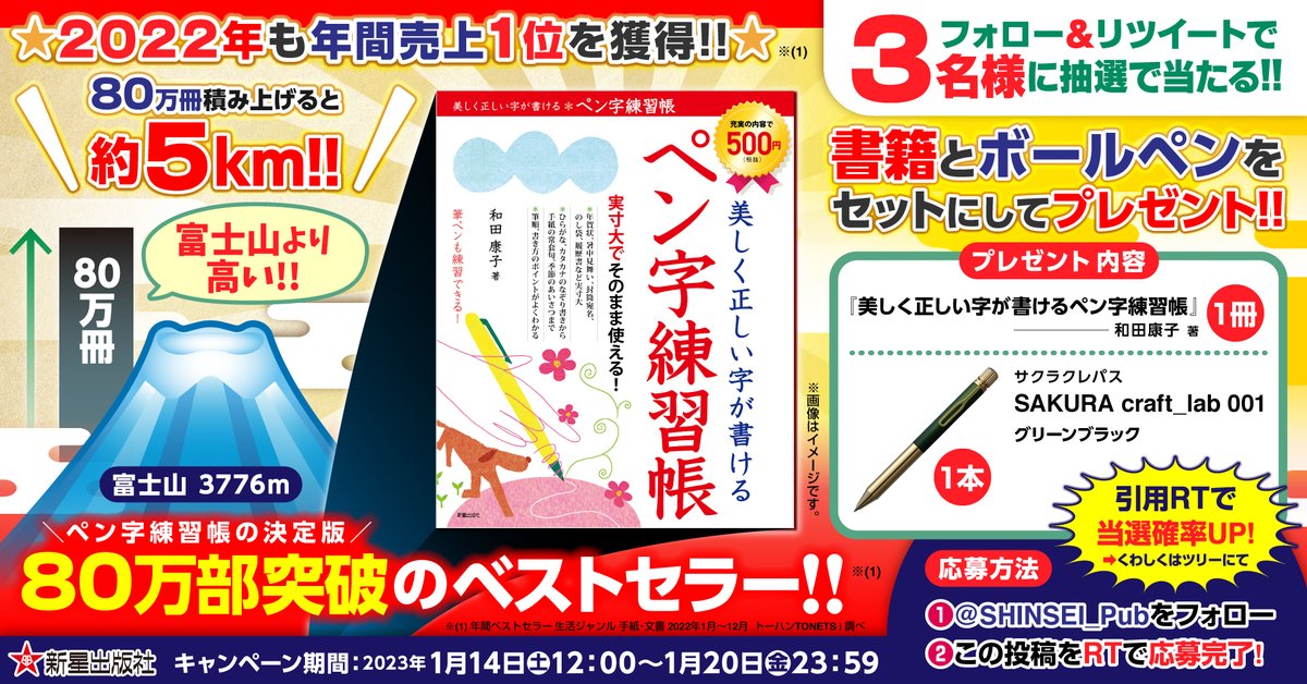 日本一売れているペン字練習帳『美しく正しい字が書ける ペン字練習帳』をサクラクレパス様の人気ボールペンと一緒に3名様に🎁