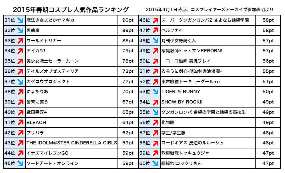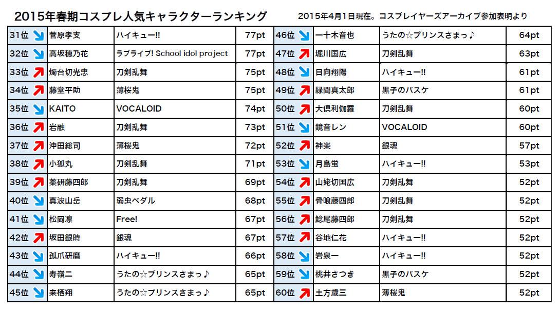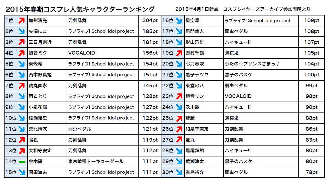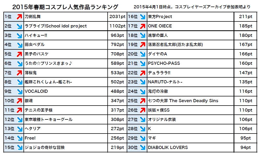【ニュース】【2015年春期】参加表明作品・キャラクター人気ランキングをリリース。彗星の如く現れた「刀剣乱舞」がコスプレ界を席巻中。春のイベントは刀剣男子レイヤーで溢れそうです。 cosp.jp/news.aspx?id=2…