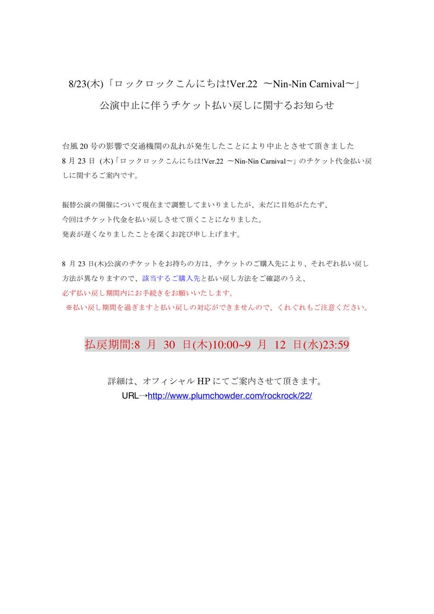 8月 23 日(木)「ロックロックこんにちは!Ver.22 〜Nin-Nin Carnival〜」のチケット代金払い戻しに関するご案内 です。
