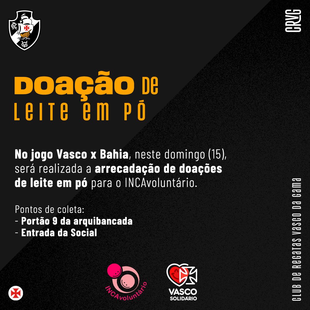 Aproveite o duelo entre Vasco x Bahia, no domingo (15), em São Januário, e contribua para a arrecadação de leite em pó na ação solidária junto ao INCAvoluntário!