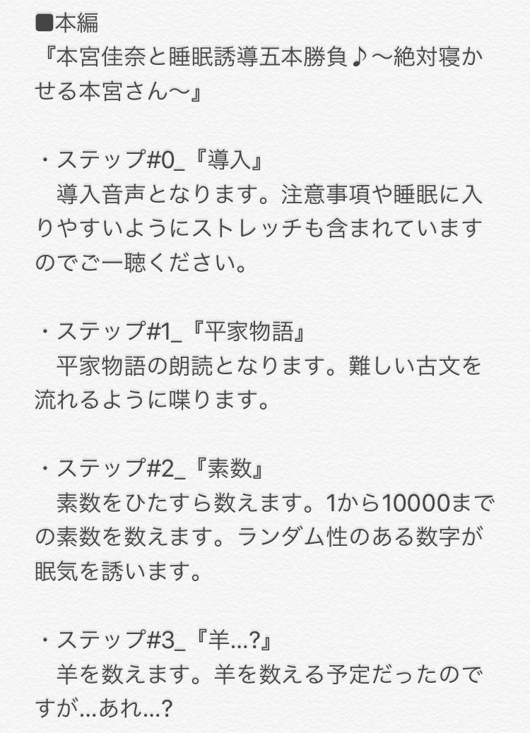 「本宮佳奈と睡眠誘導五本勝負♪~絶対寝かせる本宮さん〜」