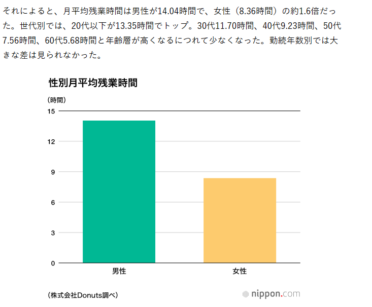 ・残業時間の月平均は男14.04時間。女性(8.36時間)の約1.6倍