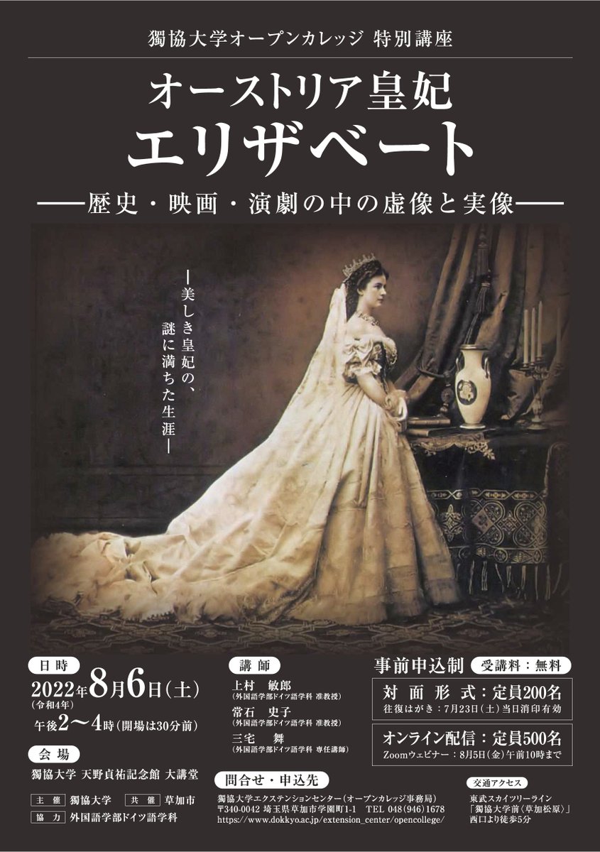 今年ミュージカル『エリザベート』ウィーン初演30周年ということで、8月6日午後2時からドイツ語学科の教員3名による皇妃エリザベートに関する無料の特別講座を開催いたします。要申込みです。対面とオンラインどちらでも受講できますので、みなさま奮ってご参加ください。TU