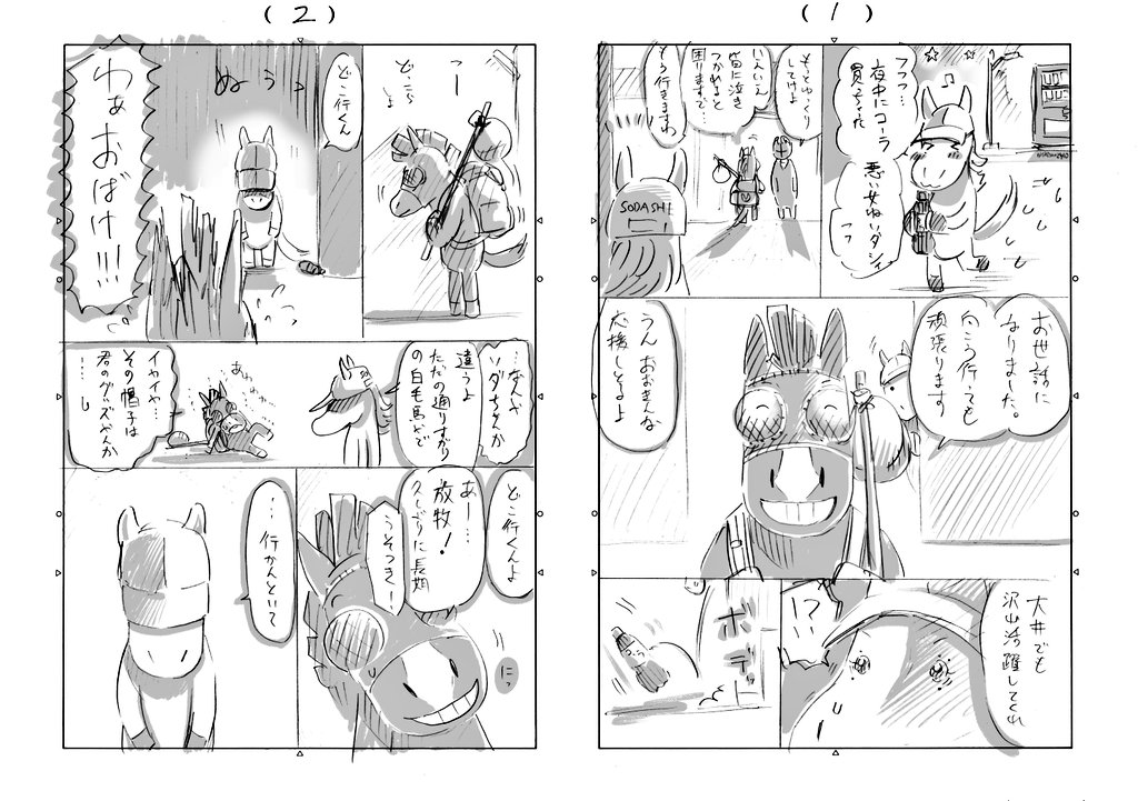 いっけなーい🦄G1G1💦あたし白毛馬のソダシ🤍マイルの大舞台でラスト直線を走ってるの❗️ゲート隣に大きなサリオスくんがいたと思ったら、今隣にいるのはキッドくん❗️すごく筋肉アピールしてぶつかってくるからもう大変😂こちとらナデシコ先輩に鍛えられてんだぞ💪次回「馬券は自己責任」お楽しみに🦄💖