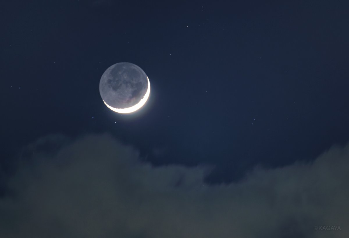 東に細い月が昇りました。月の右上の明るい星は木星と火星です。