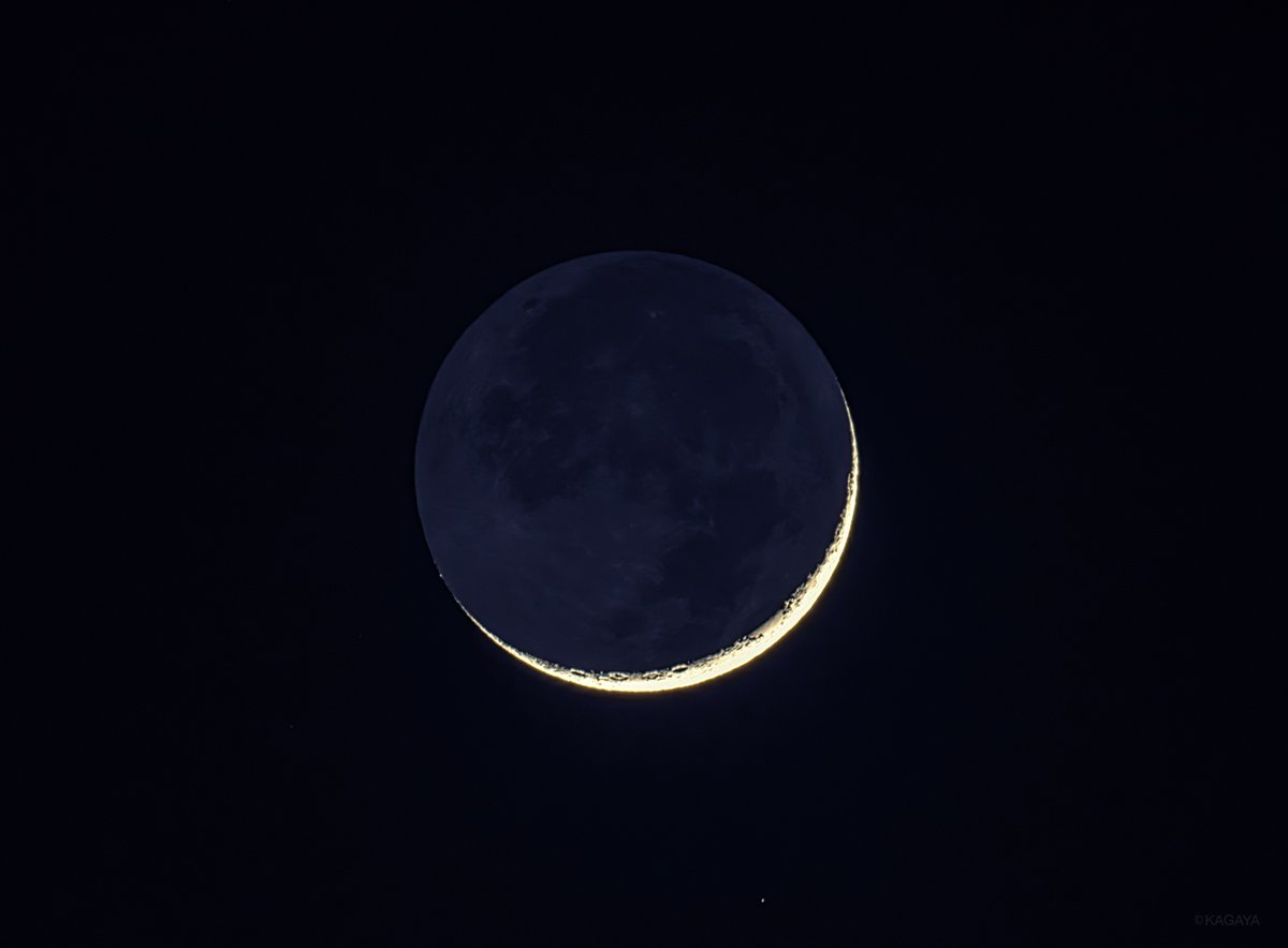 今、三日月の上のほうに見える明るい星は金星(宵の明星)です。