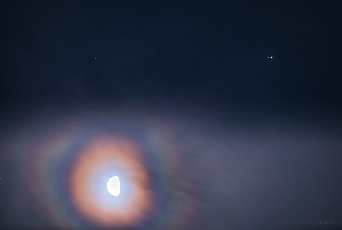 月の左下に輝く明るい星は木星です。