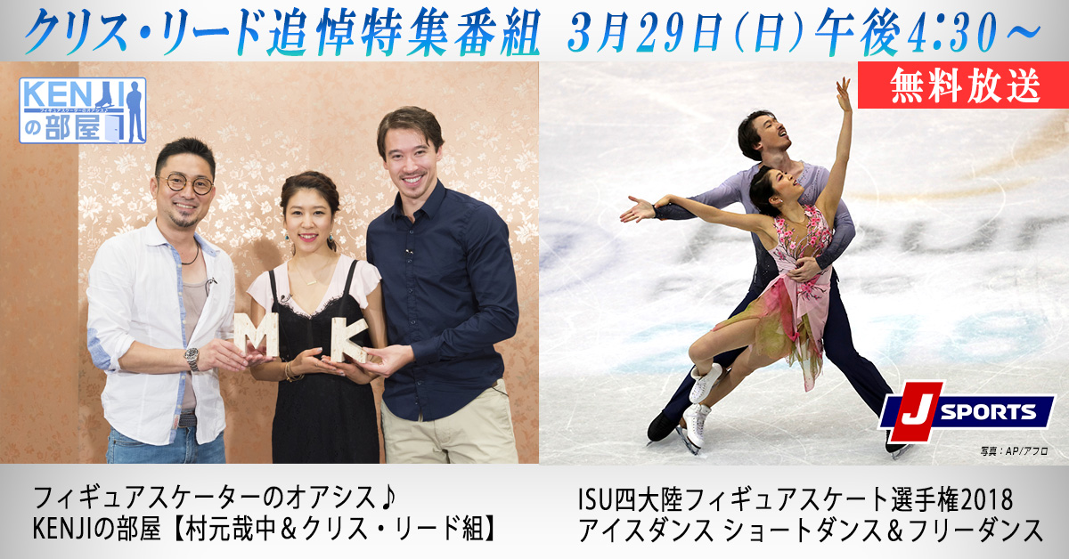 日本のアイスダンスを長年に渡ってけん引し、多くのファンに愛された日本アイスダンス界の功労者 クリス・リード氏に哀悼の意を表し 3/29(日)に追悼特集として四大陸選手権2018 アイスダンスとKENJIの部屋を無料放送します。