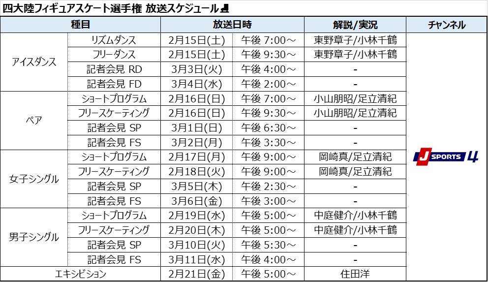 J SPORTS四大陸フィギュアスケート選手権 放送スケジュール⛸