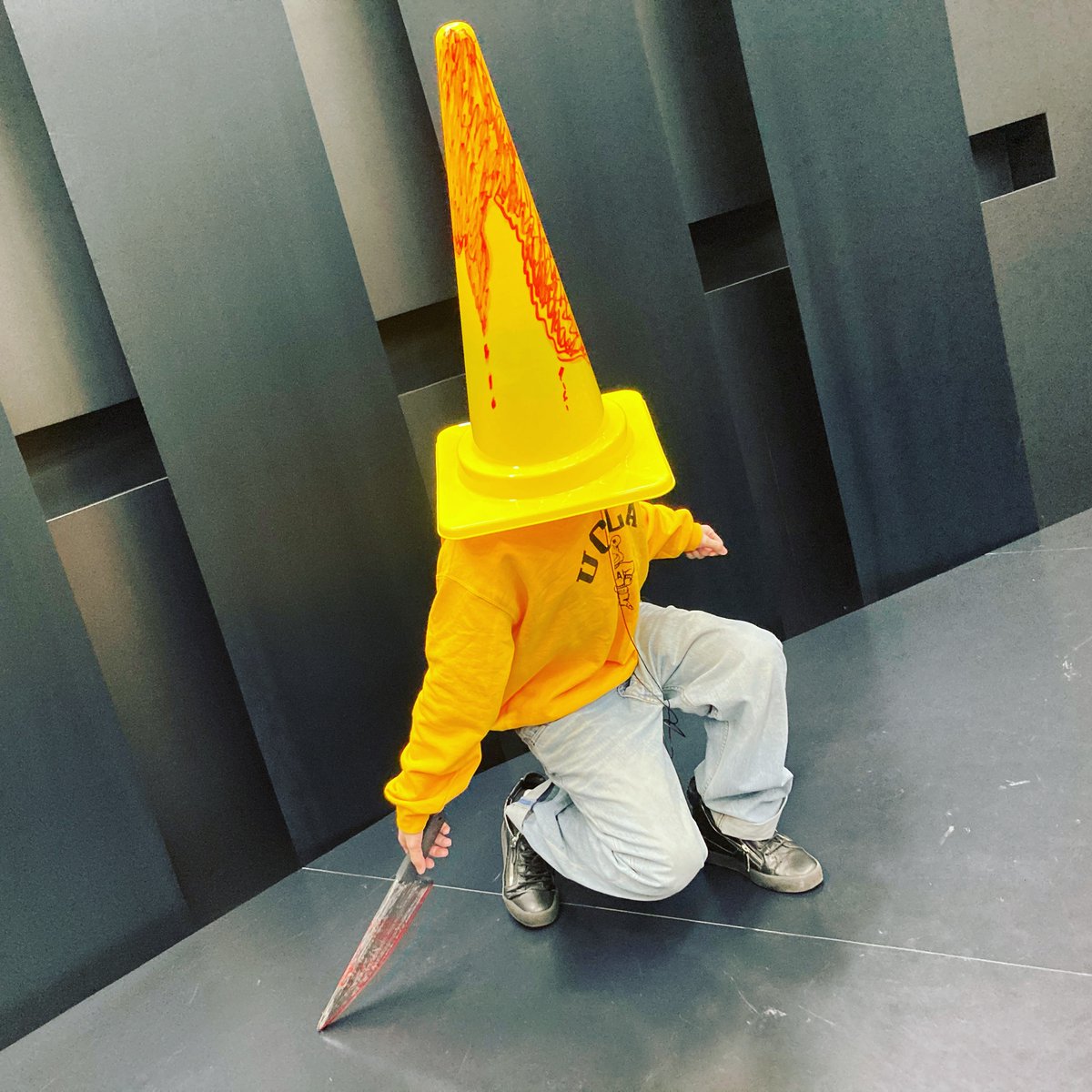去年のハロウィン生配信直前、10分で作った渾身の黄色い三角様。ナイフは安元マイヤーズ洋貴に借りました。みんなの検索の邪魔にならないよう、ハッシュタグにはしません(笑)(#)顔の見えないコス写真