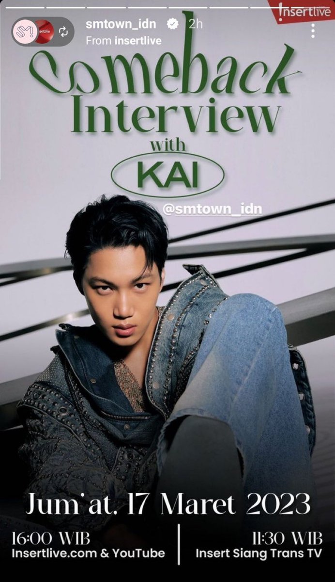 #KAI จะมีสัมภาษณ์กับทาง insert live ในวันที่ 17 มีนาคม เวลา 16.00 น.ไทย (18.00 น. เวลาเกาหลี) ทาง insertlive.com & youtube และ เวลา11.30 น.ไทย (13.30 น. KST) ทาง Insert Trans TV
