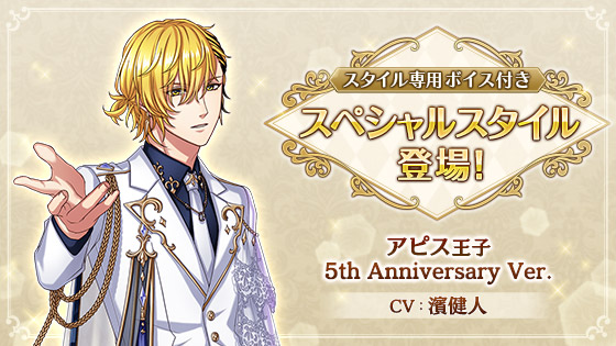 『ブルームルナジュエル交換所』にて、アピス王子(CV:濱健人)の5th Anniversary Ver.スペシャルスタイルがGETできます!