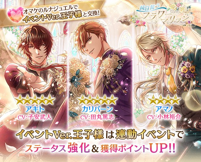 開催中のイベント『純白誓うフラワーマリッジ』は、パートナーの王子様を選択して進めるイベントです♪