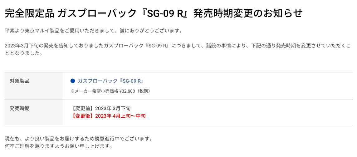 完全限定品『SG-09 R』につきまして、諸般の事情により、発売時期を「2023年4月上旬〜中旬」へと変更させていただくこととなりました。