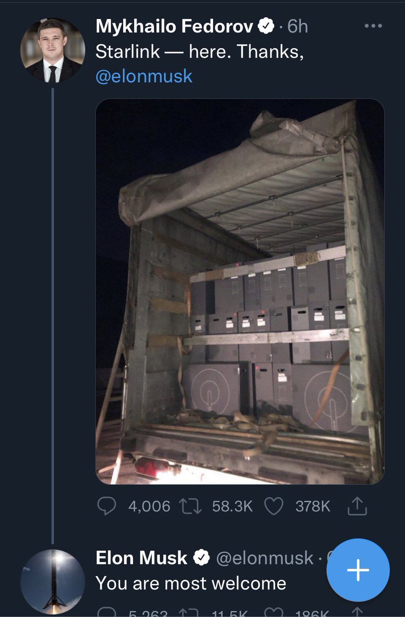 馬斯克“參戰”了。今天早上烏克蘭副總理在Twitter公開呼籲馬斯克星鍊公司支援衛星上網,剛才馬斯克回覆:現在開通了烏克蘭衛星上網服務,會提供更多接受終端。 twitter.com/elonmusk/statu…