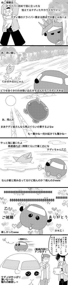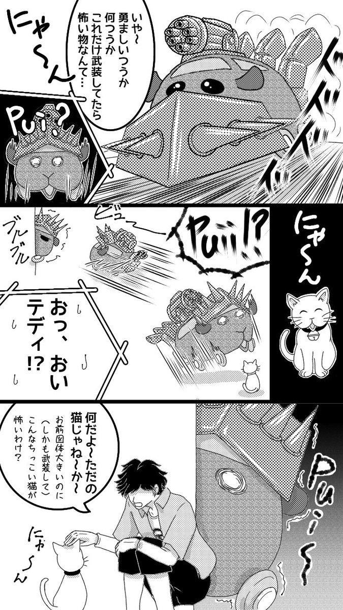わさびちゃんキュウリ食べてる間は無敵(?)モードみたいだから猫が来ても動じなさそう(キュウリ無くなったら大騒ぎ) #モルカーファンアート #モルカー