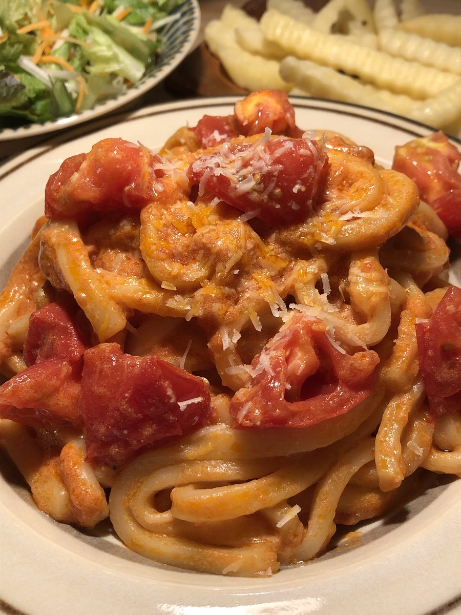 今夜はトマトクリームうどんを作りました。おいしいから週末に家族にも作ってあげたいな