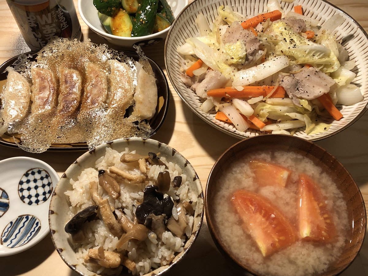 今夜は肉野菜炒めを作りました。きのこの炊き込みご飯もおいしい