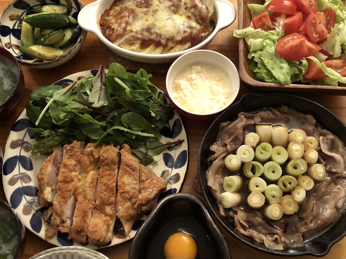 フライパンチキン南蛮、ネギと豚バラのすき焼き、ポテトミートソースグラタン、トマトとレタスのサラダなど
