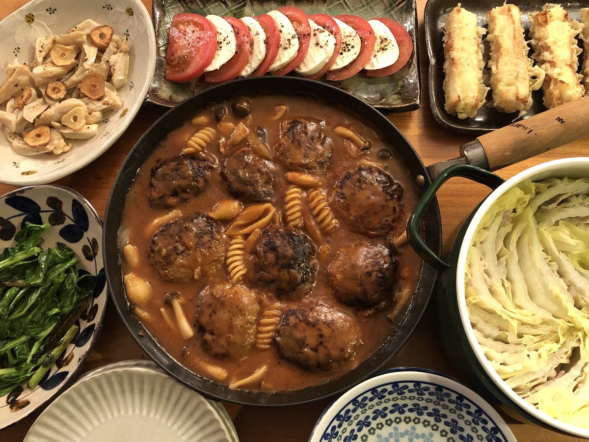 煮込みハンバーグ、豚バラ白菜のミルフィーユ鍋、鶏軟骨のレモンペッパー炒め、ちくわサラダ、カプレーゼ、かき菜の油炒めなど