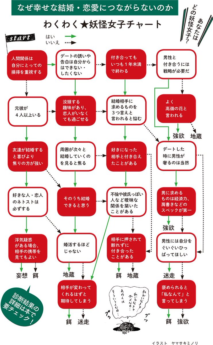 文春オンラインさんで、わくわく妖怪女子チャートの解説が載ってます♡今のところ多かったのは地蔵女子。他の皆さんのも聞きたい。