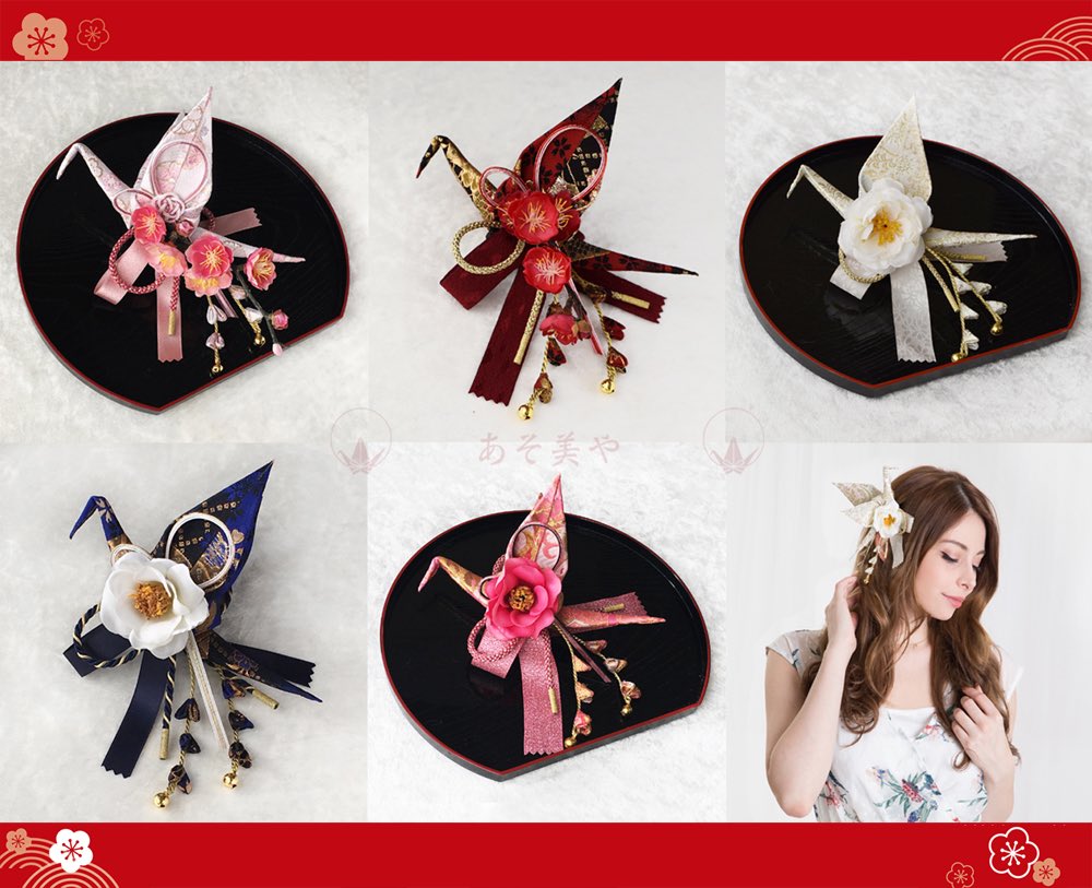 織り鶴のカチューシャ等。色柄の異なる鶴の中からお気に入りの一羽を探してみてください。