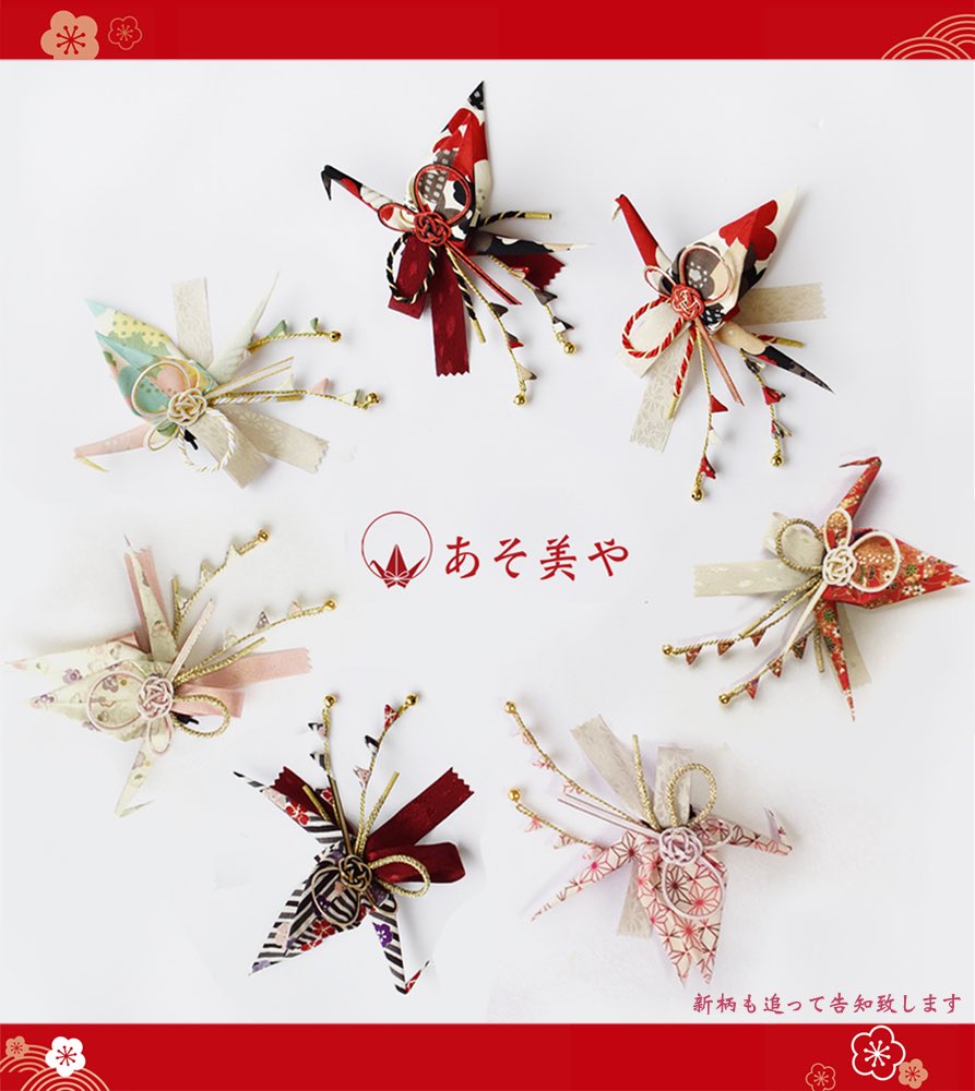 織り鶴モチーフの髪飾りやブローチです。