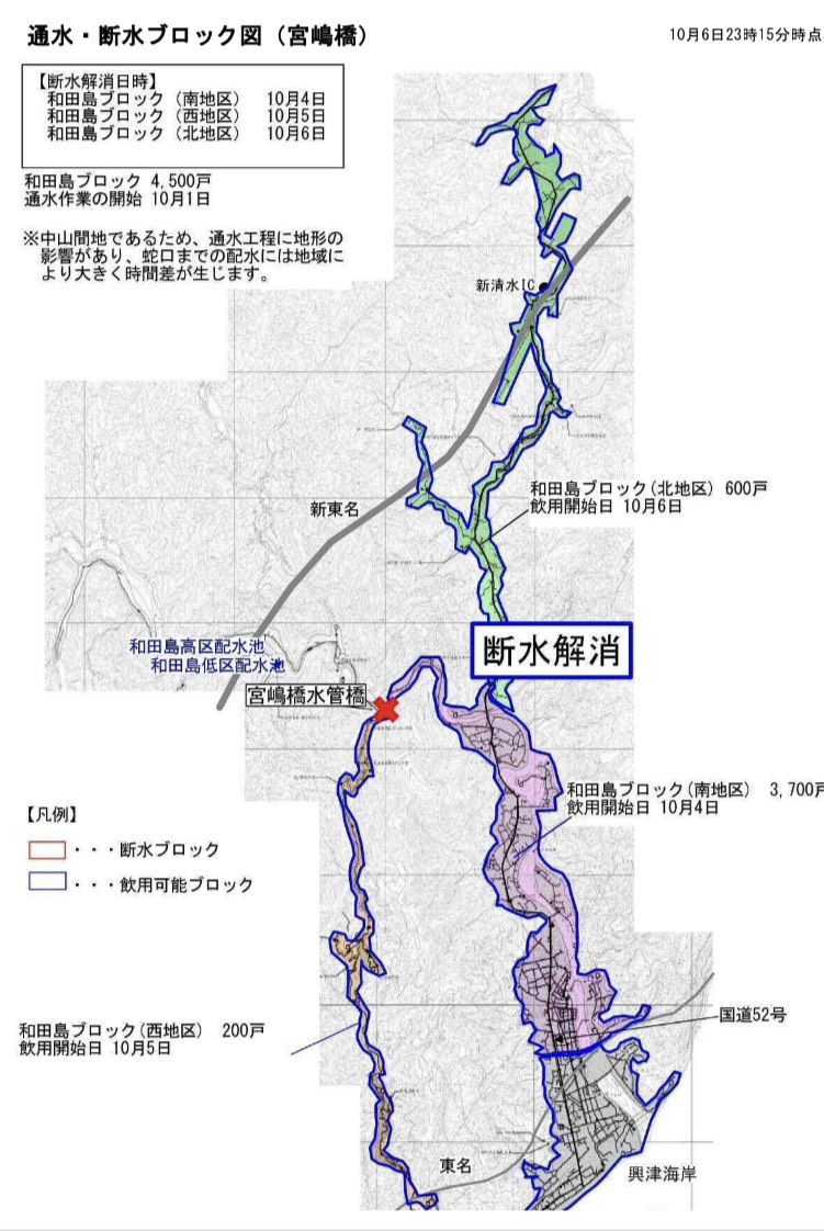 これにより、承元寺取水口の破損及び宮嶋橋の落橋により発生した清水区の断水は解消されました。