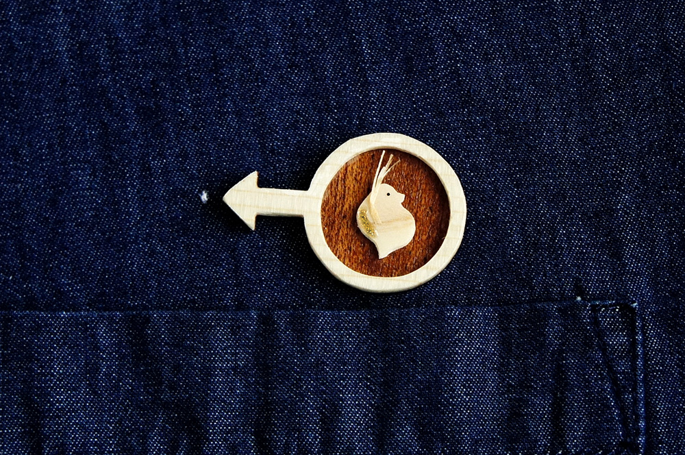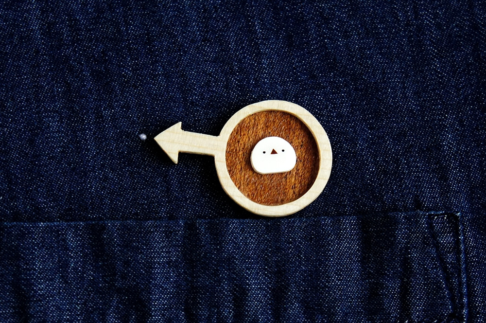 服やバッグに付いてしまったソレっぽい小さな染みや汚れが「拡大されたUFO・ミジンコ・シマエナガ・木星」になる木製のブローチです。