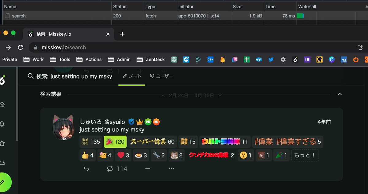 ちなみに、Misskey.ioが出来てから1番最初に投稿されたノートを検索するのに要した時間は78msです twitter.com/misskey_io/sta…