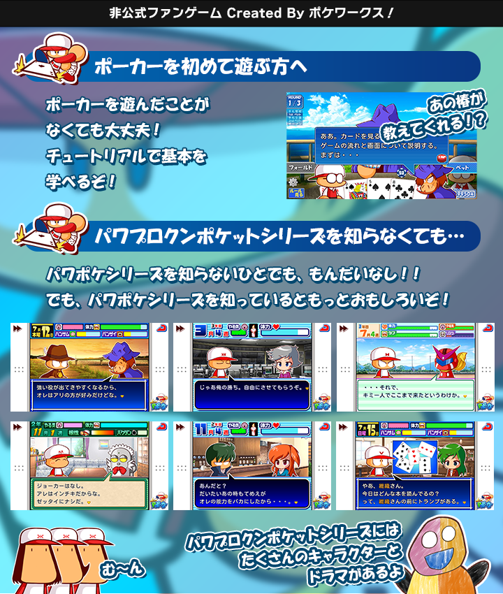 【ゲーム公開】㊗️🎉遅くなりましたが、パワポケR発売おめでとうございます!🎉✨というわけで「みんなで!Pポーカー」(P-POKER) 公開です!無料のスマホ・PC対応の非公式ファンゲームです。選べるキャラは40人以上!お話も20本以上搭載!注意書きもよくお読みください!(^o^)