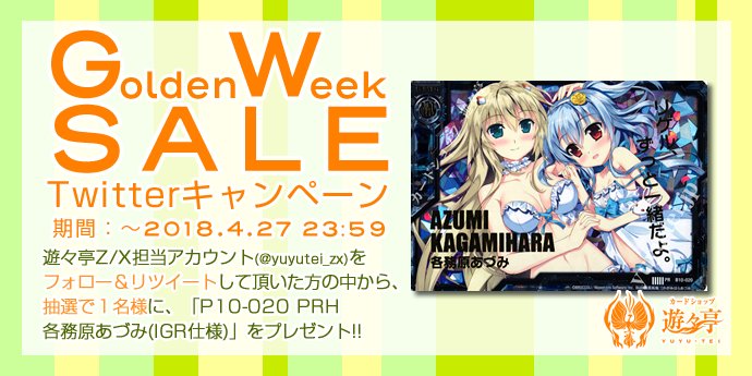 GW SALE Twitterキャンペーン! このアカウントをフォローし、本ツイートを公式RTして頂いた方から1名様に「P10-020 PRH 各務原あづみ」をプレゼント! yuyu-tei.jp/game_zx/